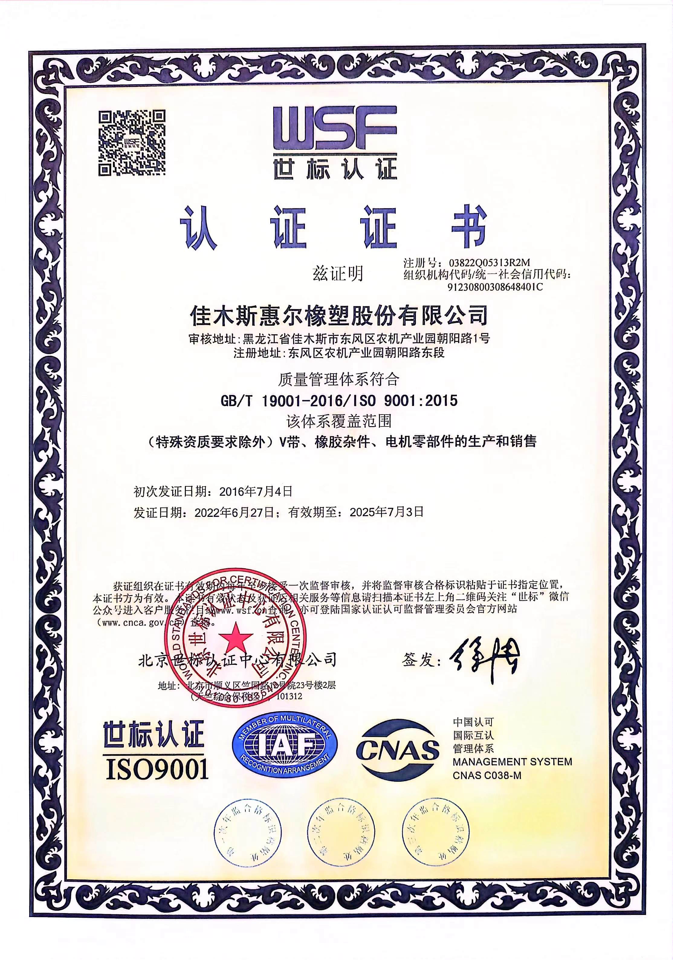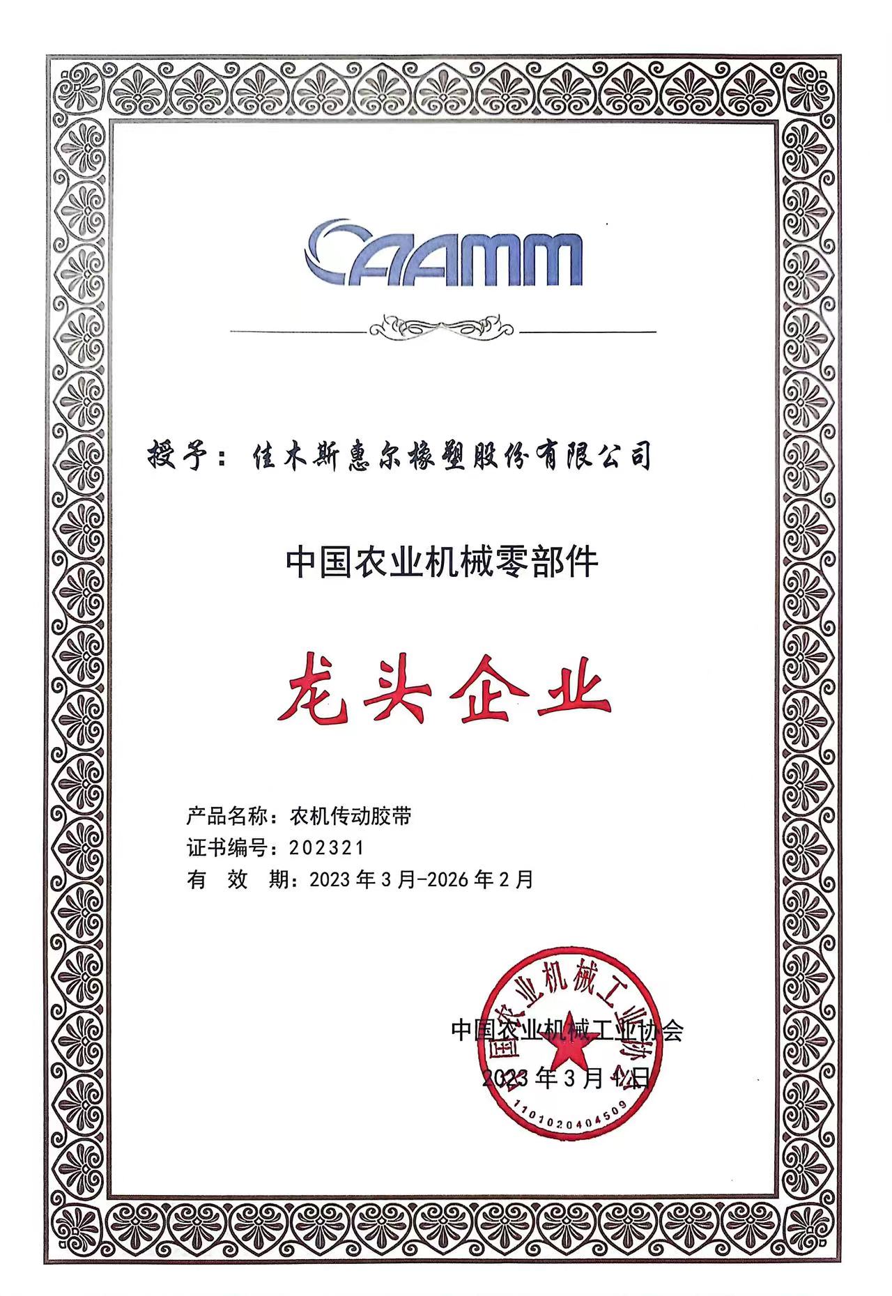 公司通過了ISO9001:2016質(zhì)量管理體系認(rèn)證,榮獲了高新技術(shù)企業(yè)稱號,獲得了由中國農(nóng)業(yè)機(jī)械工業(yè)協(xié)會授予的農(nóng)機(jī)零部件(橡膠傳送帶)“龍頭企業(yè)”證書。環(huán)星品牌被評選為 “精耕杯”用戶滿意十佳農(nóng)業(yè)機(jī)械零部件產(chǎn)品金獎。產(chǎn)品還獲得全省用戶滿意產(chǎn)品、黑龍江省榮譽。
